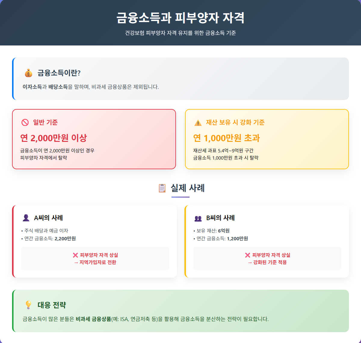 - 금융소득이 연 2,000만원 이상인 경우 피부양자 자격에서 탈락합니다.